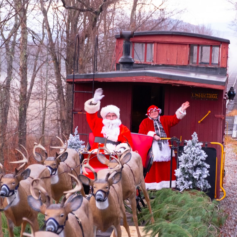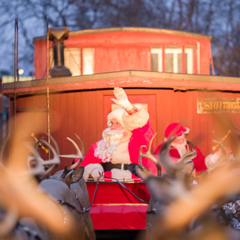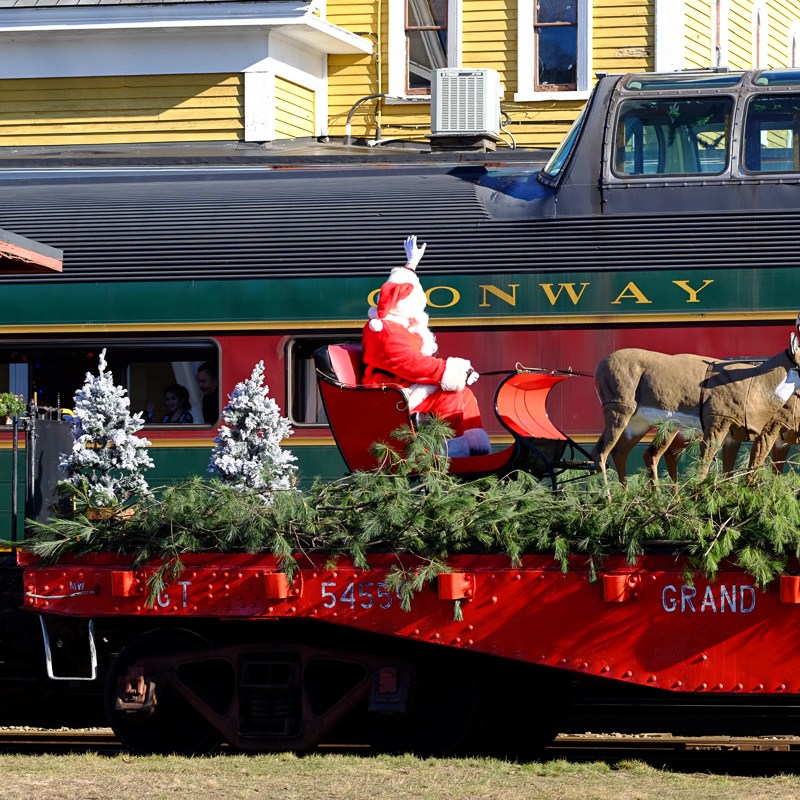 Our Train Master/Road Foreman of Engines Mike Lacey recalled that when he was a child growing up in Meadville, Pennsylvania, Santa would arrive on the Erie Railroad in a caboose, and one year his father was the engineer on the train! What was good for the Erie, might be good for Conway Scenic. With this suggestion, Dave Swirk expanded the concept, and soon we had a vintage sleigh and nine reindeer positioned on our former Grand Trunk flat car with our former Central Vermont wooden bodied caboose (now lettered Conway Scenic 75955 ) in tow. Dave and the shop crew arranged for the reindeer to be positioned on rockers so that when Santa pulled the reins the deer rocked back and forth. The effect was charming and very convincing! We even had a red-nosed reindeer in the lead.